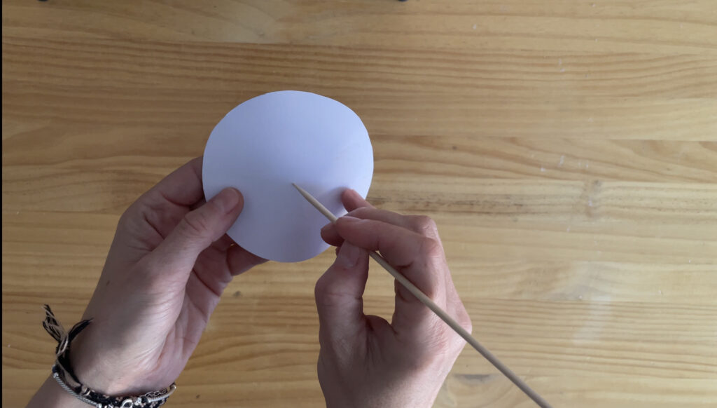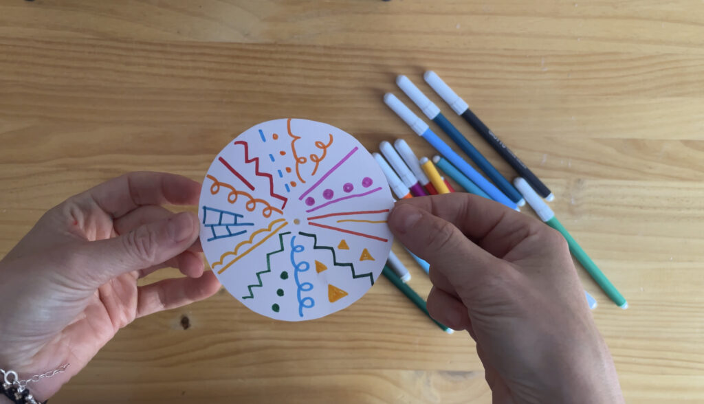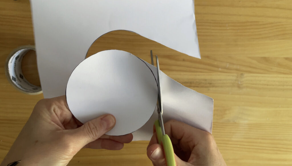 - Jarraian, paper zuri batean borobil bat marraztuko dugu. Borobil honen neurria gure tutuarena baino handiagoa izan beharko da, gutxienez bikoitza. Guk zelo baten laguntzarekin marraztu dugu borobila. Borobila marraztu ondoren, moztu egingo dugu eta jarraian zulotxo bat egingo diogu erdian. Bukatzeko, bertan kolore ezberdinetako marrazkiak egingo ditugu, hauek erditik hasi eta kanpoaldera marraztu beharko dira.