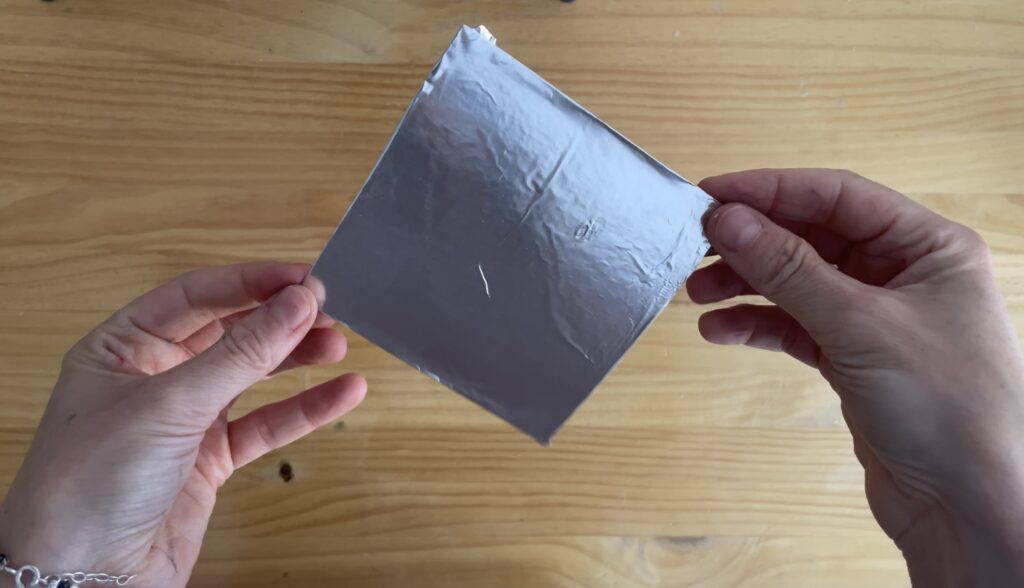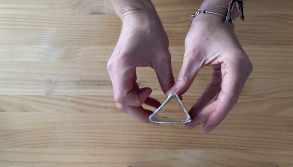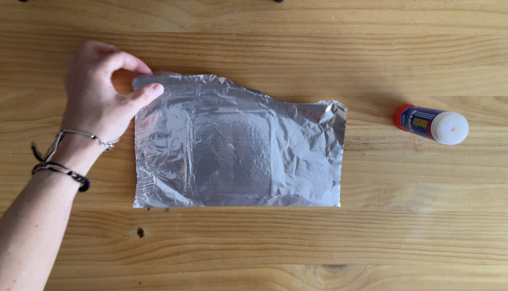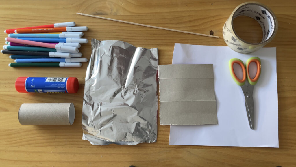 - Kaleidoskopioaren ispiluak egiteko aluminio papera erabiliko dugu, horretarako, kartoi zati batean aluminio papera itsatsiko dugu. Gogoratu berau ondo itsasteaz. Jarraian hiruki forma emango diogu eta zelo zati batekin eutsiko dugu, ostean tutu barruan sartuko dugu.
