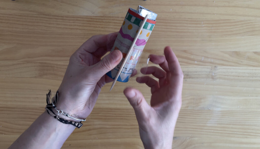 - Amaitzeko, tutuari makiltxo bat itsatsiko diogu eta makilaren puntan marrazkiekin osatutako borobila txertatuko dugu.