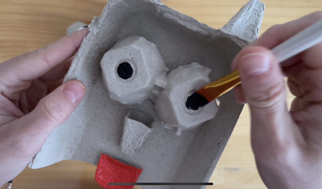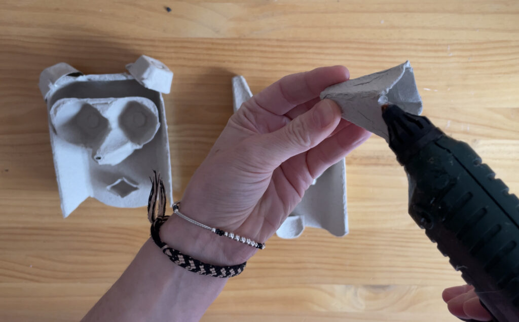 5. Guk bi aurpegi ezberdin osatzea erabaki dugu, horretarako atalak silikonarekin itsatsi ditugu. Gainera kolore pixka bat emateko asmoz hauek apaintzea erabaki dugu, hala ere, margotu gabe utzi daitezke.