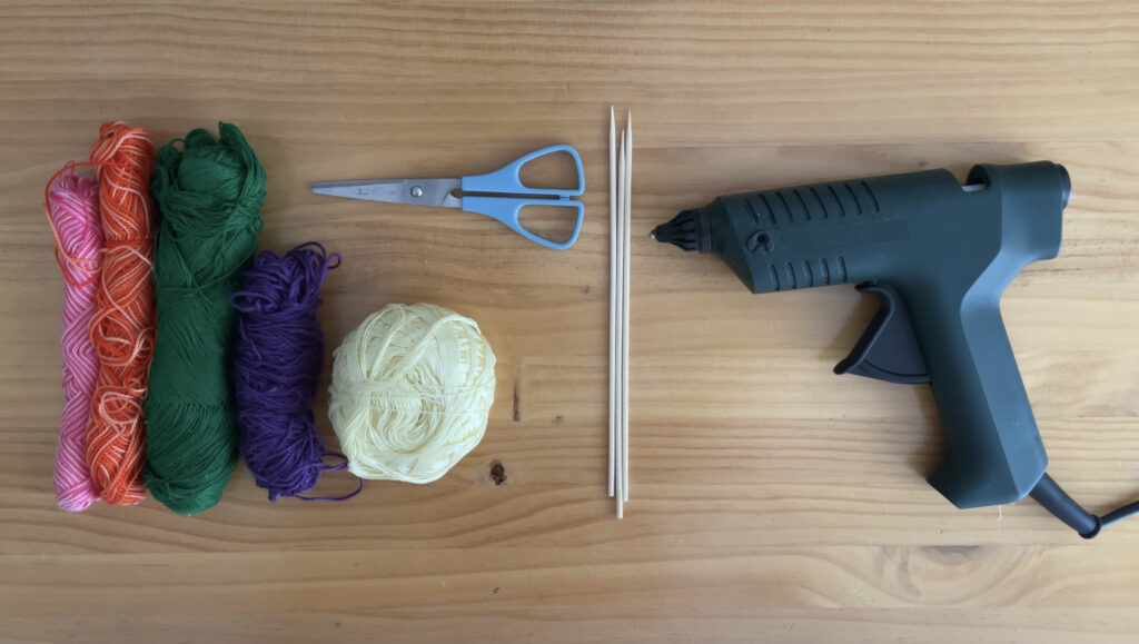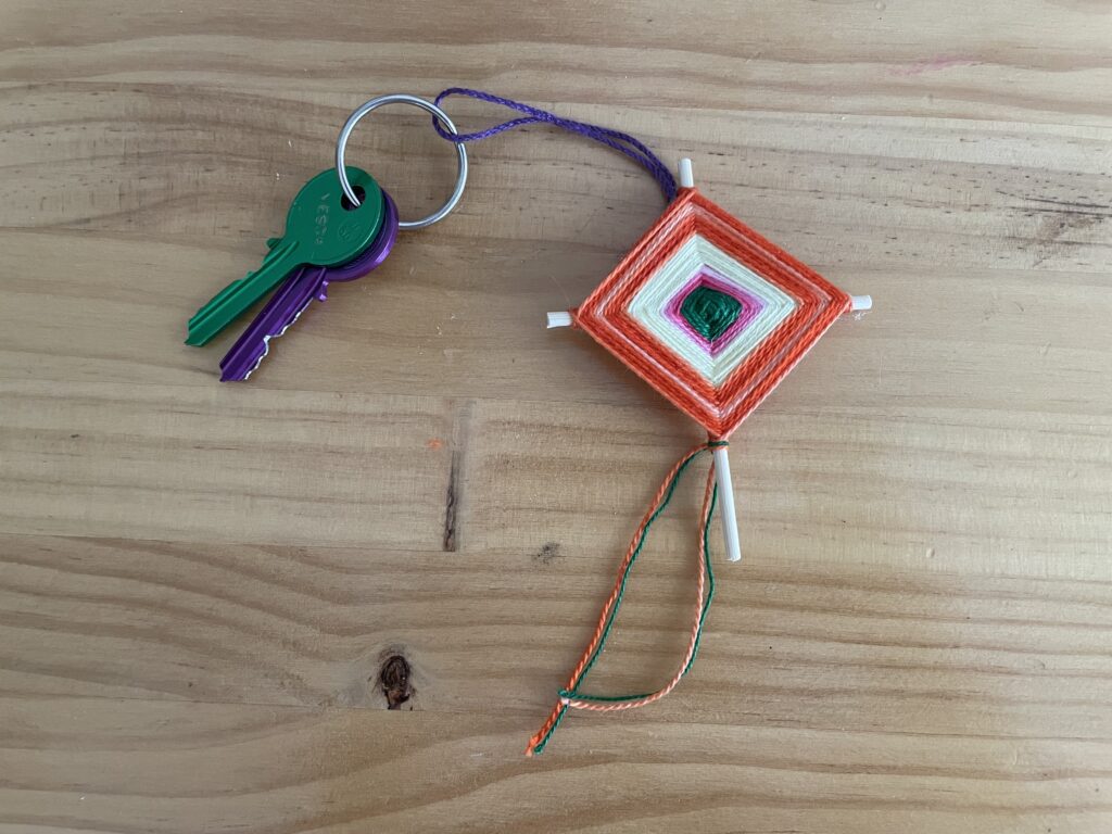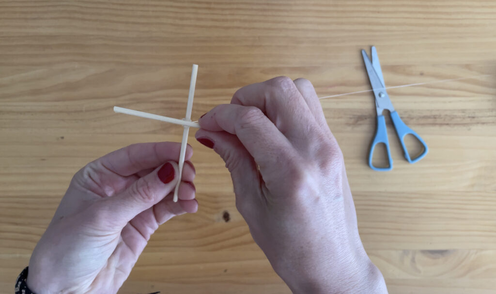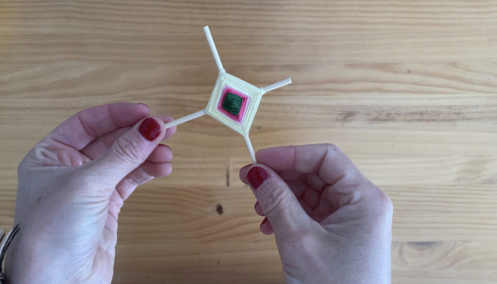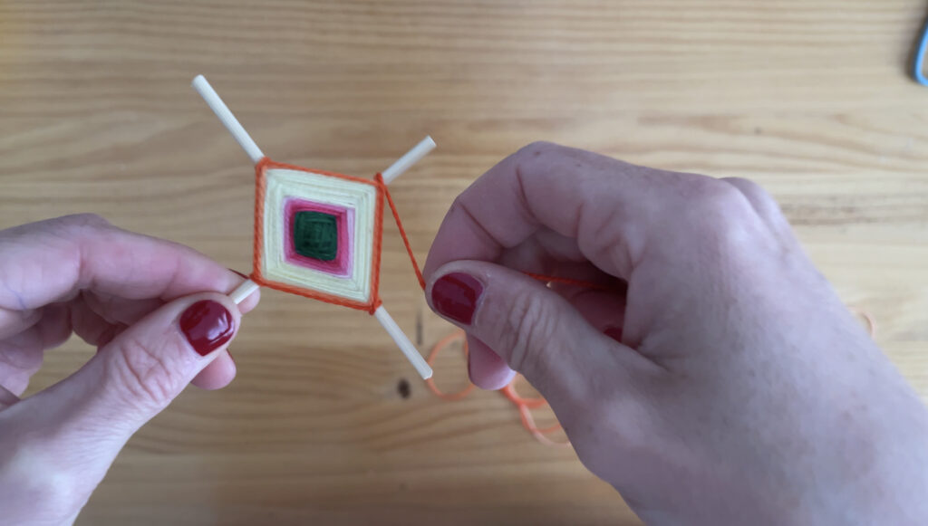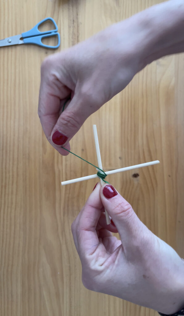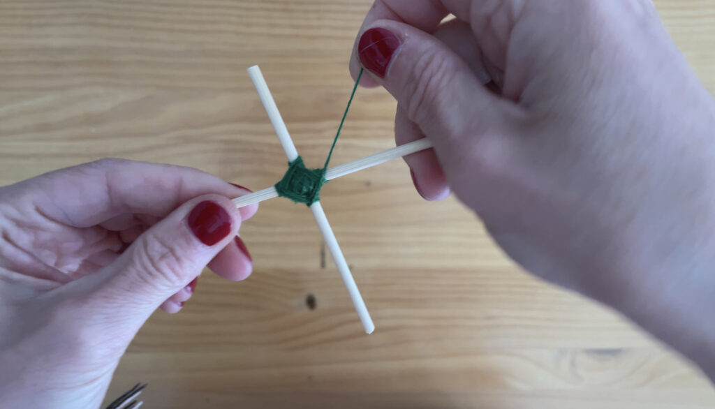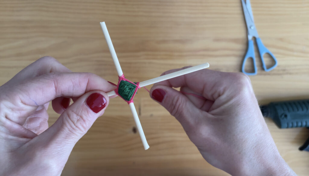 - Ondoren, artile zati bat hartu eta bi makilen erdian inguratzen hasiko gara. Erdiko zatia sendo dagoenean, artilea makil mutur guztietatik pasatzen hasiko gara, makil bakoitzean buelta bat emanez. Kometaren egitura sendo gera dadin, tentsio pixka batekin lotuko dugu artilea. Eman nahi adina buelta, zenbat eta buelta gehiago, orduan eta kometa handiagoa osatuko dugu.