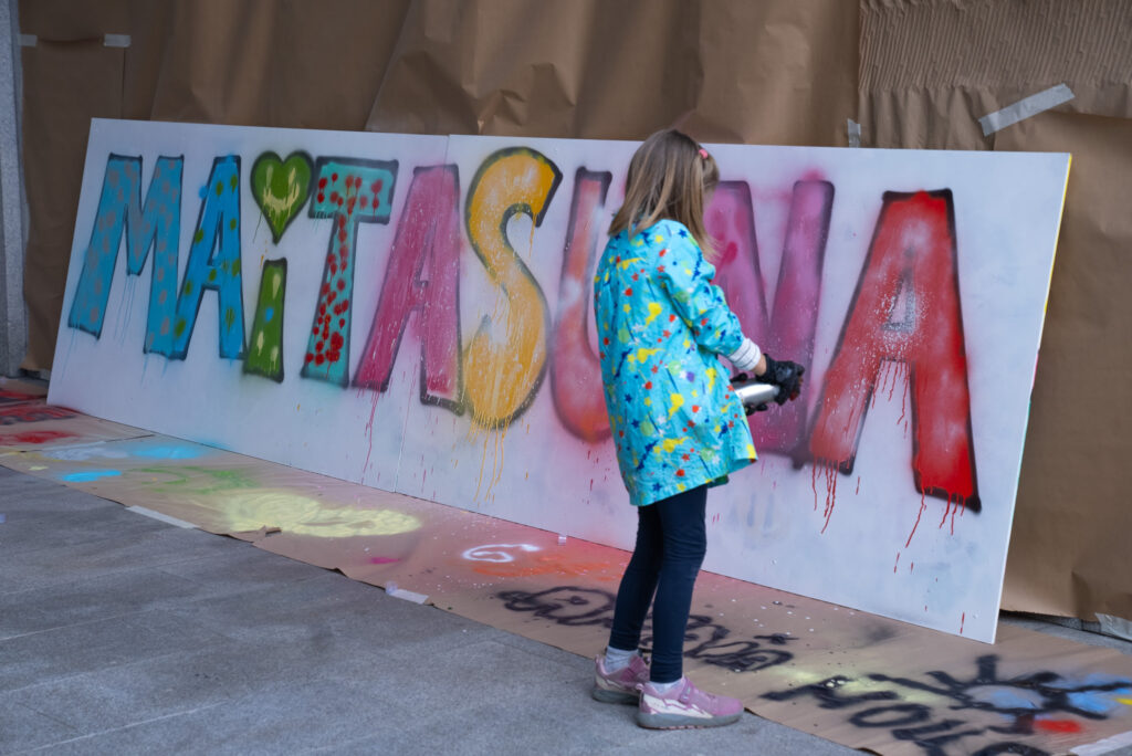 Amaitzeko, gazteak kalera atera eta grafiti erraldoi bat sortzera animatu ziren. Espraien bidez koloreak nahastu eta formekin jolastuz, mezu argi bat utzi zuten horman: “Maitasuna”.